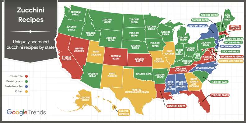 Všetky férové otázky. Podľa Googlu v USA vrcholí cuketa najčastejšie v auguste spolu so zeleninovou sezónou. Ľudia začnú nad cuketou premýšľať v máji. Podľa informácií spoločnosti Google v tom čase ľudia začali hľadať „ako pestovať cuketu“. Väčšina Kalifornčanov a Floridčanov hľadá recepty na plnené cukety, zatiaľ čo ľudia na severozápadnom Pacifiku, v Novom Anglicku a v častiach Stredozápadu hľadajú dobrý recept na cuketový chlieb.